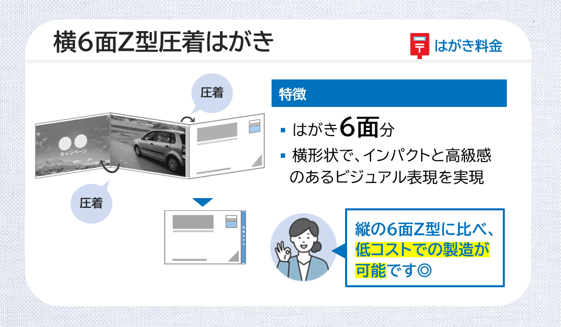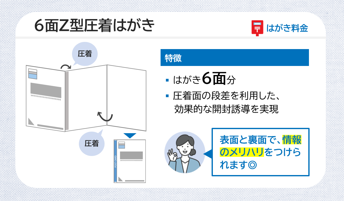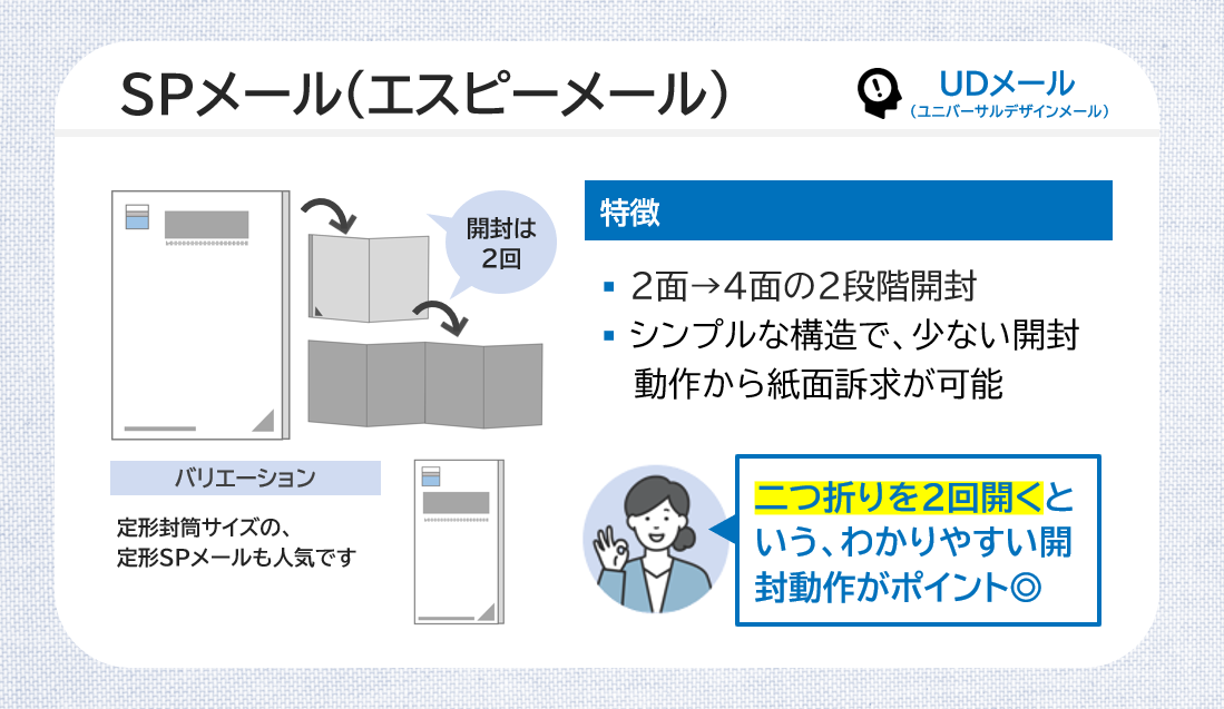 ありそうで無かった!二つ折り×2回の新しい圧着DM。「定形SPメール」は、郵便料金値上げ対策をしながら、集客や販売促進におすすめのダイレクトメール仕様です。