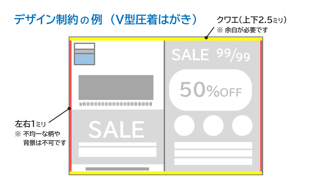 ●「V型圧着はがき」の場合、版面内に左右1ミリずつのデザイン制約があります。