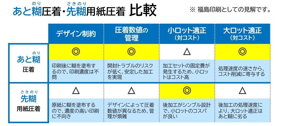 先糊用紙圧着との比較において、メリットの多いあと糊圧着を採用しています。