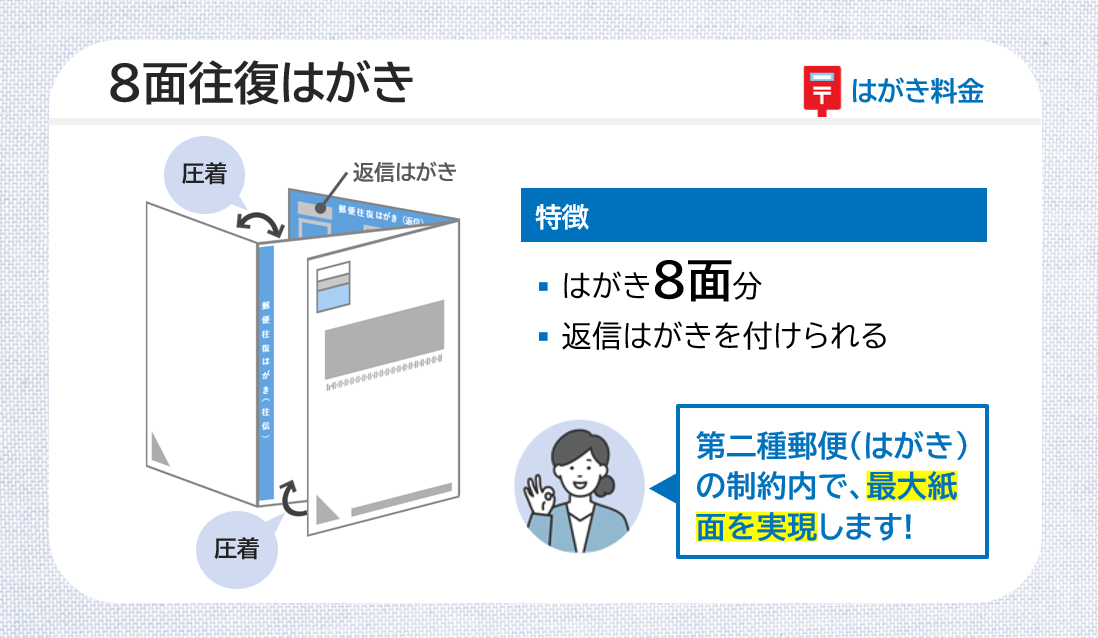 福島印刷では、お客さまの使いやすさに寄り添う圧着DMのラインナップを取り揃えております。