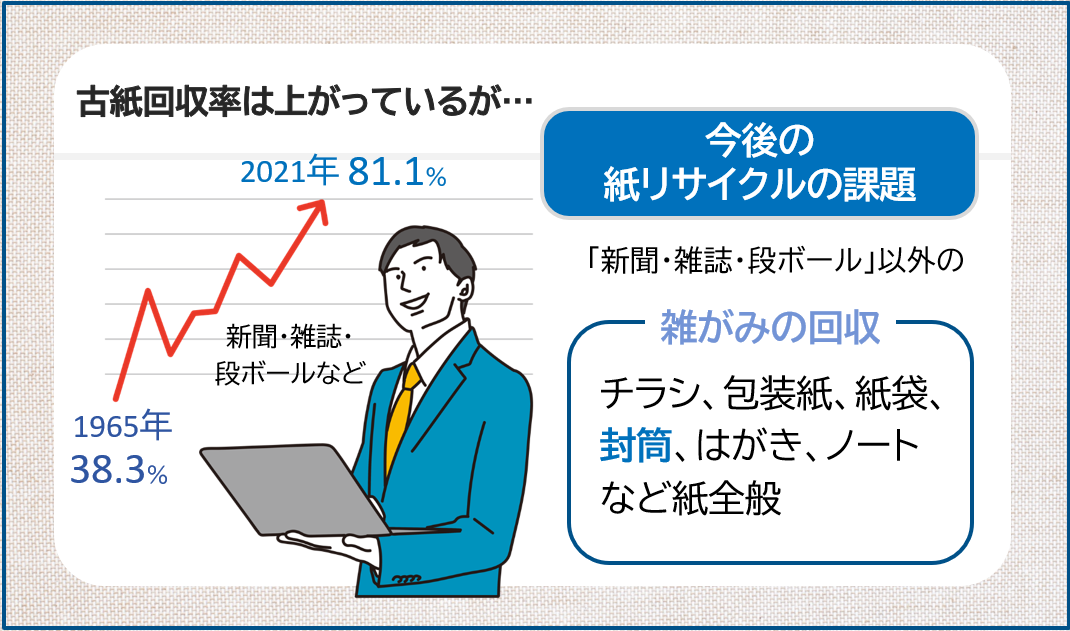 「雑がみ」と呼ばれる「新聞」「雑誌」「段ボール」以外の紙類の回収が、今後の重要課題です。