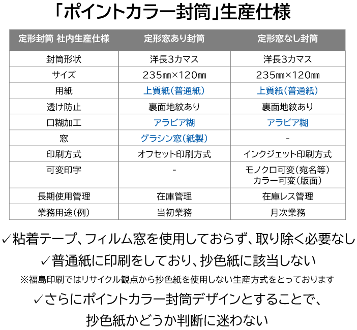 福島印刷の「ポイントカラー封筒」は、リサイクルしやすい設計を徹底しています。