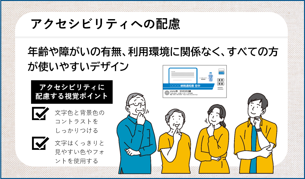 文字色と背景色の十分なコントラストや、見やすいフォントの採用により、情報が確実に伝わるよう配慮しています。アクセシビリティの高い封筒は、多様な利用者が混在する自治体業務や企業活動においても、誰もがストレスなく利用できる大きなメリットとなります。