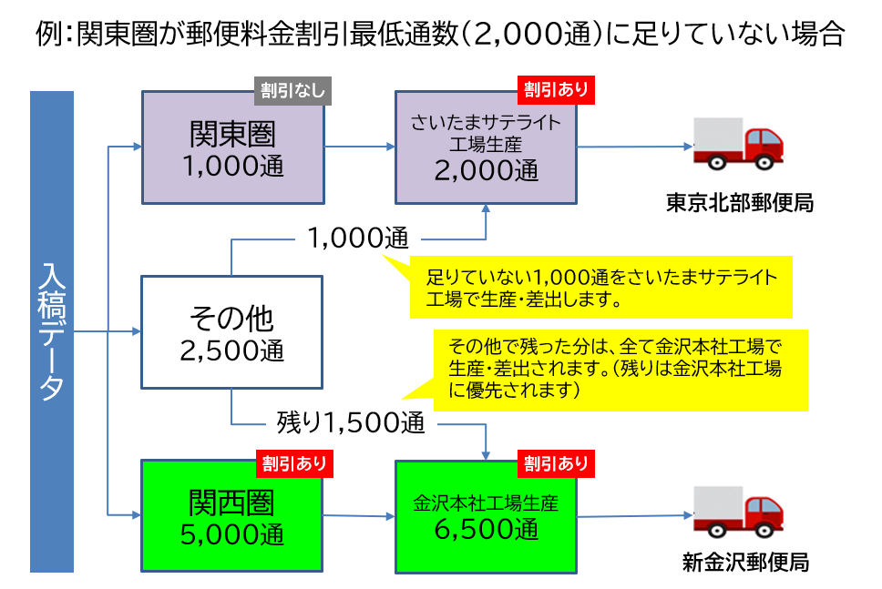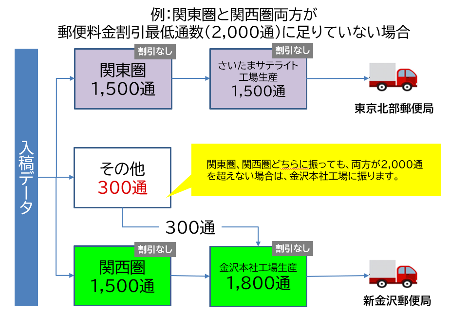 ※2拠点への分割を行うことにより、1拠点ごとの差出通数が減ってしまい、1拠点での発送の場合に比べ、郵便割引の適用ができなくなる、または、割引率が低くなる場合がございます。
